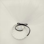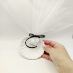 Χειροποίητη μπομπονιέρα με κεραμικό κοχύλι λευκό, σκούρο μπλε σουετ κορδόνι, λευκό διπλό τούλι και πέντε κουφέτα πέρλα, τέσσερα λευκά και ένα γαλάζιο. Ιδανική πρόταση για τελετές δίπλα στην θάλασσα.