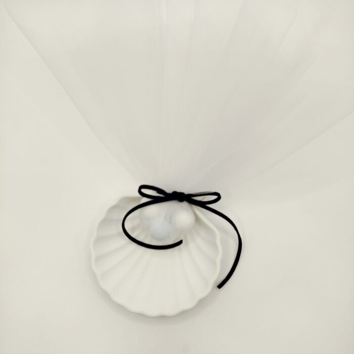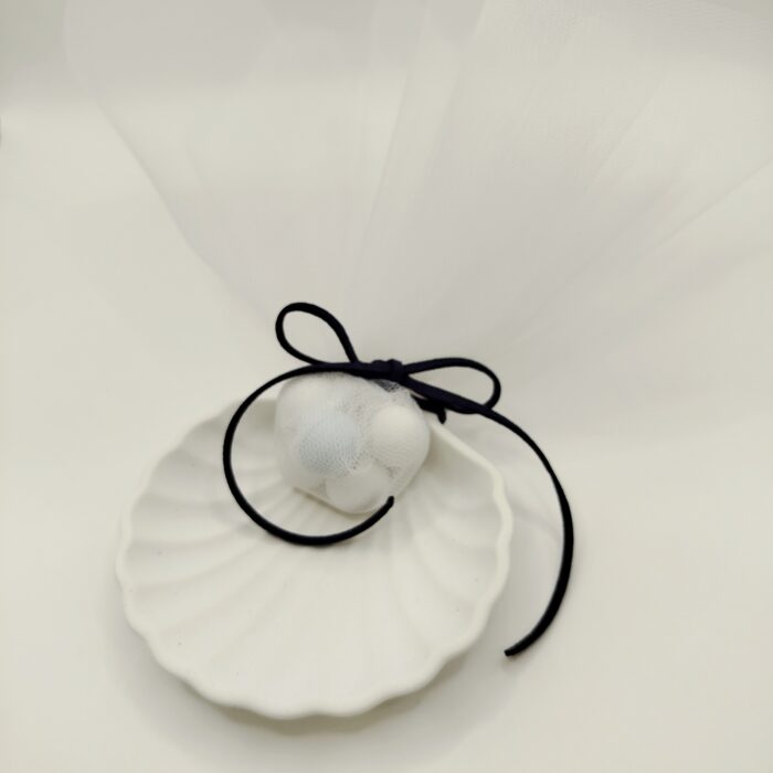 Κεραμική μπομπονιέρα κοχύλι, με σκούρο μπλε σουετ κορδόνι, λευκό τούλι και πέντε κουφέτα πέρλα.