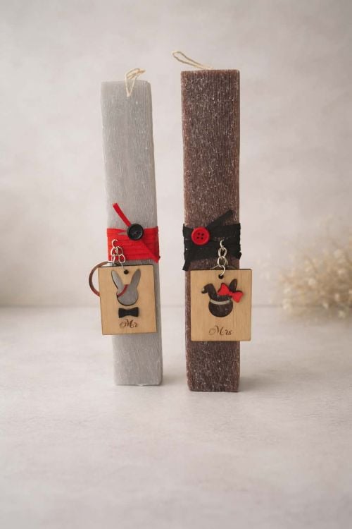 Λαμπαδάκια για ζευγάρι Mr. και Mrs. με μπρελόκ, σε αποχρώσεις του γκρι, του μαύρου και του κόκκινου. Ξυστές αρωματικές κοντές λαμπάδες, με ξύλινο στοιχείο κουνελάκι κύριος και κυρία σε μπρελόκ με χρηστικότητα και μετά την Ανάσταση. Ένα όμορφο δώρο για εσάς ή φιλικά σας ζευγάρια.