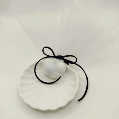 Μπομπονιέρα κοχύλι με πέρλα, με διπλό λευκό τούλι, μπλε σκούρο σουέτ κορδόνι και πέντε crispy κουφέτα πέρλα.