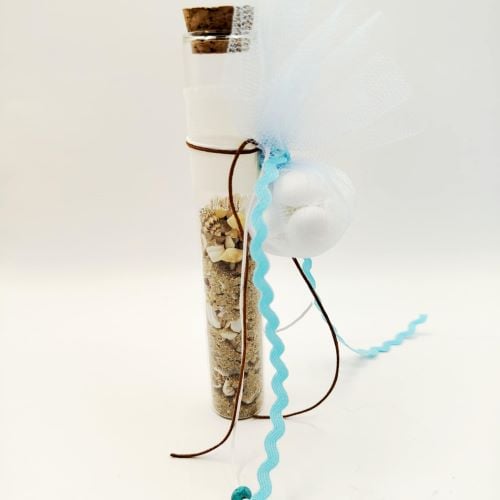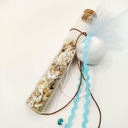 Μπομπονιέρα βάπτισης δοκιμαστικός σωλήνας για αγόρι με άμμο, πετρούλες και κοχύλια.