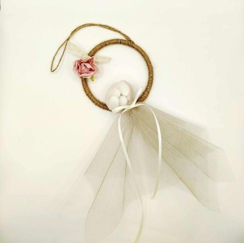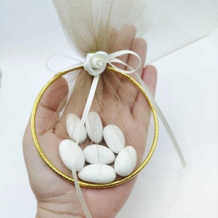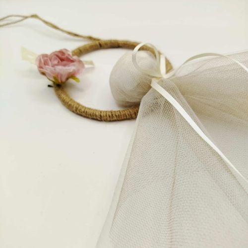 Μπομπονιέρα βάπτισης με τριαντάφυλλο, δεμένη πάνω σε κρίκο λινάτσας. Με πέντε ή επτά κλασικά κουφέτα, διπλό τούλι σε γήινες αποχρώσεις και εκρού κορδέλα γκρο, τριανταφυλλάκι σάπιο μήλο και μια λεπτομέρεια δαντέλας. Ιδανική πρόταση για βάπτιση κοριτσιού ή και γάμου σε ρομαντική διάθεση.
