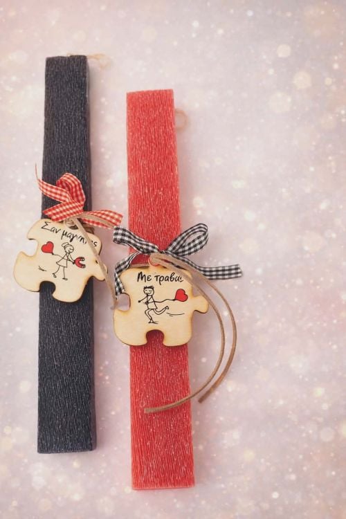 Σετ λαμπάδες για ζευγάρι με ξύλινο παζλ αγάπης δεμένες στο χέρι. Δύο εντυπωσιακές αρωματικές λαμπάδες, σε μαύρο και κόκκινο χρώμα, με ξύλινα κομμάτια παζλ που ενώνονται συμβολικά. Κάθε κομμάτι έχει μαγνήτη στο πίσω μέρος έτσι ώστε να κρατηθεί και μετά το Πάσχα στο ψυγείο ή σε οποιαδήποτε μεταλλική επιφάνεια.