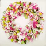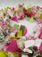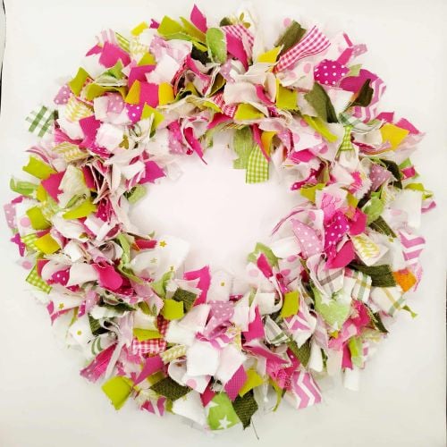 Χειροποίητο διακοσμητικό στεφάνι διαμέτρου 30 εκ., φτιαγμένο με ρετάλια υφασμάτων σε αποχρώσεις κυρίως του φούξια, του πράσινου και λίγες νότες κίτρινου και χρυσού. Χρησιμοποιήθηκαν περισσότερα από 300 κομμάτια υφάσματος και δέθηκαν όλα στο χέρι. Ιδανικό για στολισμό εξώπορτας, παιδικό δωμάτιο ή δώρο βάπτισης.