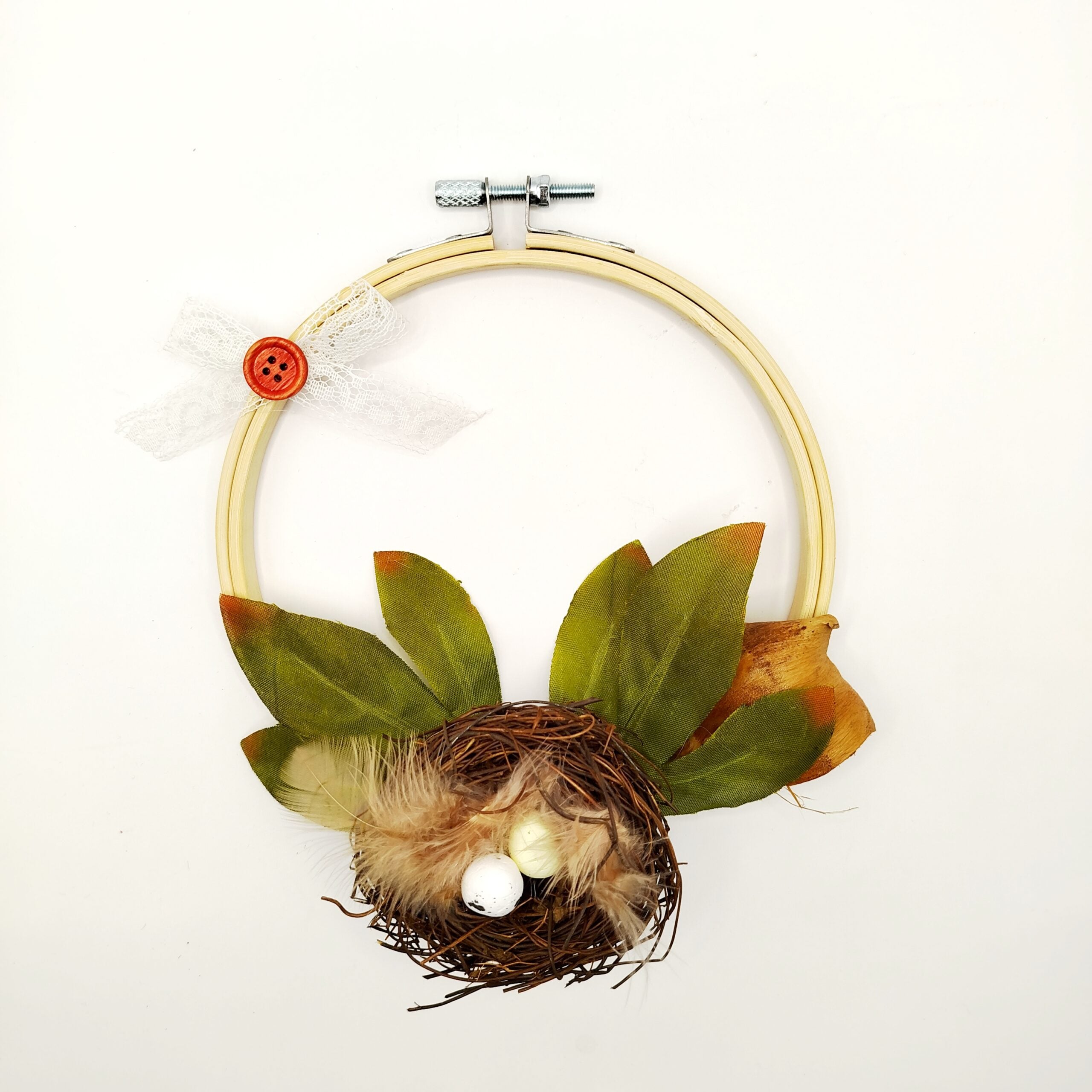 Ξύλινο τελάρο κεντήματος 18 εκ. με φύλλα, φωλιά κι αυγά πουλιών.