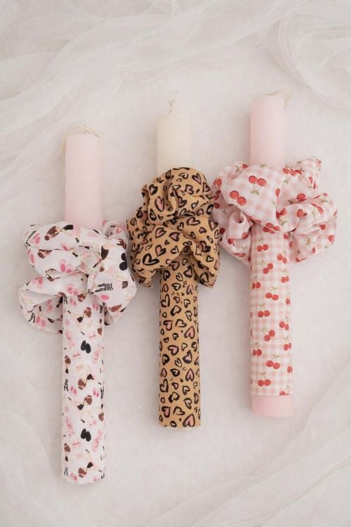 Χειροποίητη λαμπάδα με scrunchie σε τρία διαφορετικά ντεσέν.