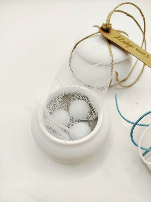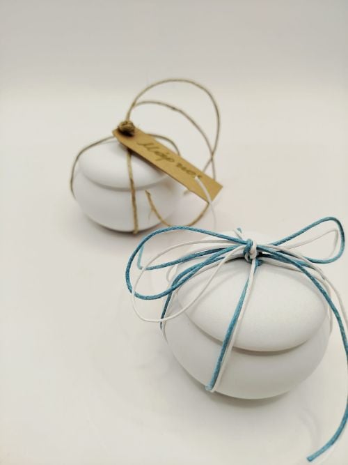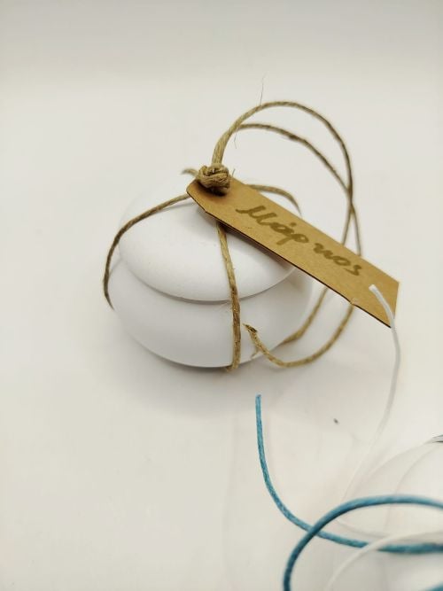 Χειροποίητη μπομπονιέρα macaron λευκή και γαλάζια, με διάφορα εναλλακτικά δεσίματα και συνδυασμούς υλικών και χρωμάτων. Με καρτελάκι κραφτ που μπορεί να γράφει το όνομα του παιδιού η ένα ευχαριστήριο μήνυμα και τρία κουφέτα crispy Χατζηγιαννάκη.