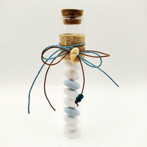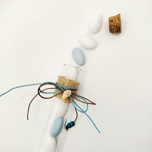 Χειροποίητη μπομπονιέρα βάπτισης δοκιμαστικός σωλήνας για αγόρι, με κουφέτα δύο αποχρώσεων και θαλασσινό στολισμό.