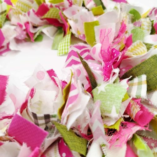 Χειροποίητο στεφάνι εξώπορτας φούξια από ρετάλια, διαμέτρου 30 εκ. Φτιαγμένο με ρετάλια υφασμάτων σε αποχρώσεις κυρίως του φούξια, του πράσινου και λίγες νότες κίτρινου και χρυσού. Με περισσότερα από 300 κομμάτια υφάσματος δεμένα στο χέρι. Ιδανικό για στολισμό εξώπορτας, παιδικό δωμάτιο ή δώρο βάπτισης.