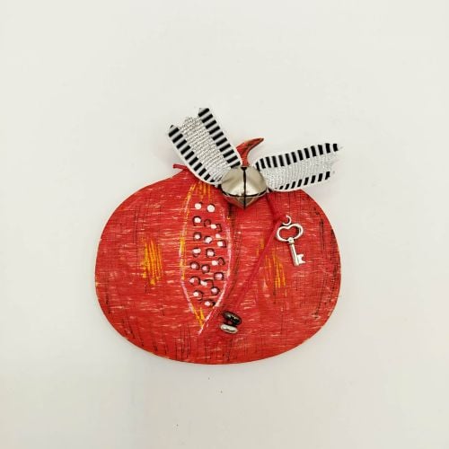 Χειροποίητο ξύλινο ρόδι γούρι 2026 με μαγνήτη, ζωγραφισμένο στο χέρι. Με ιριδίζουσα κορδελίτσα, κουδουνάκι, μεταλλικές χάντρες και κλειδάκι. Στο πίσω μέρος έχει μαγνήτη, ιδανικό για ψυγείο ή άλλες μεταλλικές επιφάνειες.