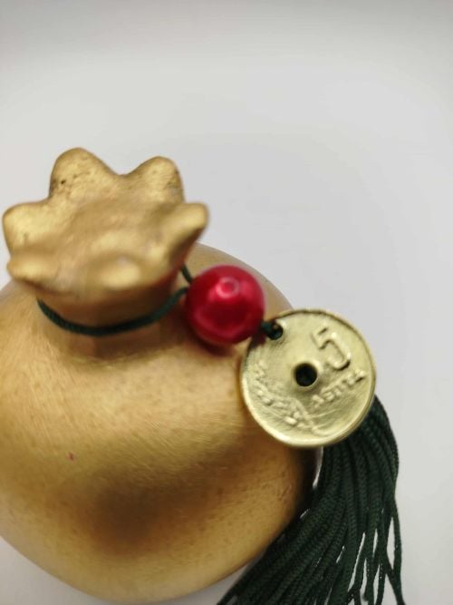 Χειροποίητο χρυσό κεραμικό γούρι ρόδι, με κυπαρισσί φούντα, κόκκινη χάντρα πέρλα και μια πεντάρα.