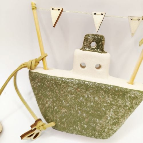 Χειροποίητo χριστουγεννιάτικo κεραμικό καραβάκι 26 πράσινο από το εργαστήρι κεραμικής Kypseli.