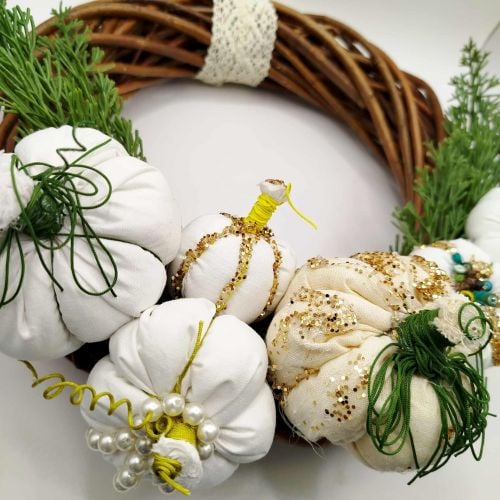 Χειροποίητο χριστουγεννιάτικο στεφάνι με κολοκύθες, πέρλες, χρυσόσκονη και κλαδιά.