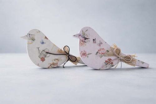 Ξύλινο διακοσμητικό πουλάκι σε δύο διαφορετικά χρώματα και με ανοιξιάτικη διακόσμηση. Οι διαστάσεις του είναι 16×9 και ο στολισμός του έγινε με την τεχνική του decoupage. Μόνο του ή σε συνδυασμό δίνει έναν γιορτινό και χαρούμενο τόνο στο σπίτι.